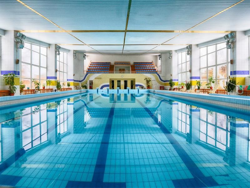 Современный крытый бассейн с каскадом и панорамным видом на прекрасную природу. Размер бассейна 25х10 метров (5 дорожек). Находится в отдельно стоящем здании и равноудален от всех корпусов на 100-200 м.